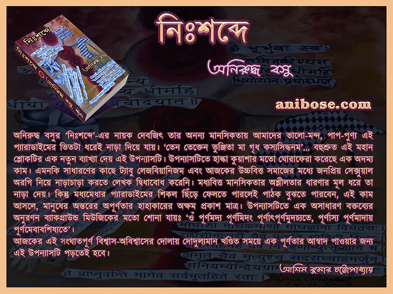 Aniruddha Bose's “NISHABDE” (though I personally think it should be NIHSHABDE) is a disturbing novel. Disturbing in the sense that it gives a strong jolt to the complacency of the placid life and thinking of ours. It is a tale of a mosaic of conflicting paradigms. Our intra-personal paradigms, which dictate our expected behaviour in a structured social network; our inter-personal paradigms which governs our relationship with dyads, triads and groups we do or we think we do belong; social paradigms which judge or intend to judge the members of the society; our religious paradigms which keep a very strong leash on our id, ego and superego and our spiritual paradigms which try to keep a fine balance between the aforesaid groups of paradigms. It tales about the thoughts and deeds of an extra-ordinary man, a man so advanced in his intellect, that sometimes it hovers near the absurd. We, the ordinary mortals, are always striving for the success, success in everything, in every spheres of our world. Only to find that in the long run, the so-called success achieves nothing. The ultimate is beyond the mundane success and failure, and that is not, I repeat, not beyond our reach. Only we have to open our minds, focus our intellect and realize our feelings.