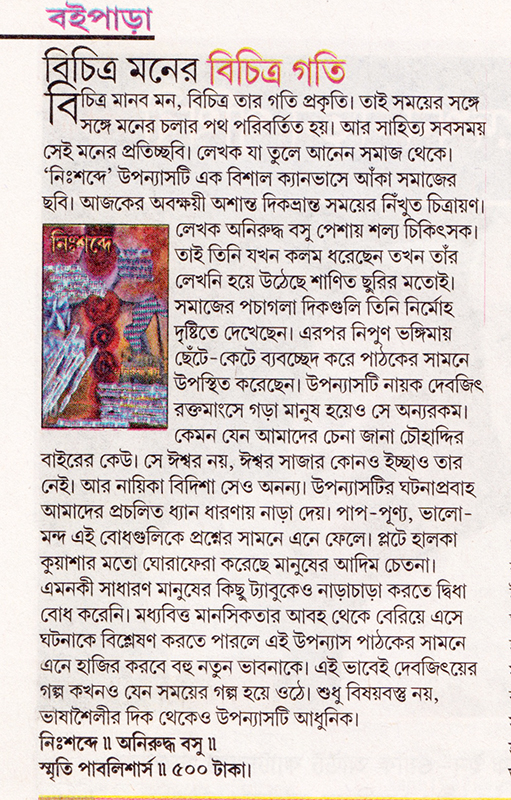 The novel Nishabde written by Dr Aniruddha Basu is based on the complex relationship of people of modern civilized society. The selfishness, rate-race and, endless ambitions of people is dragging the civilisation towards a dark horizon. Dr Bose's thought and concept is far ahead than his contemporary writers. A good book really.